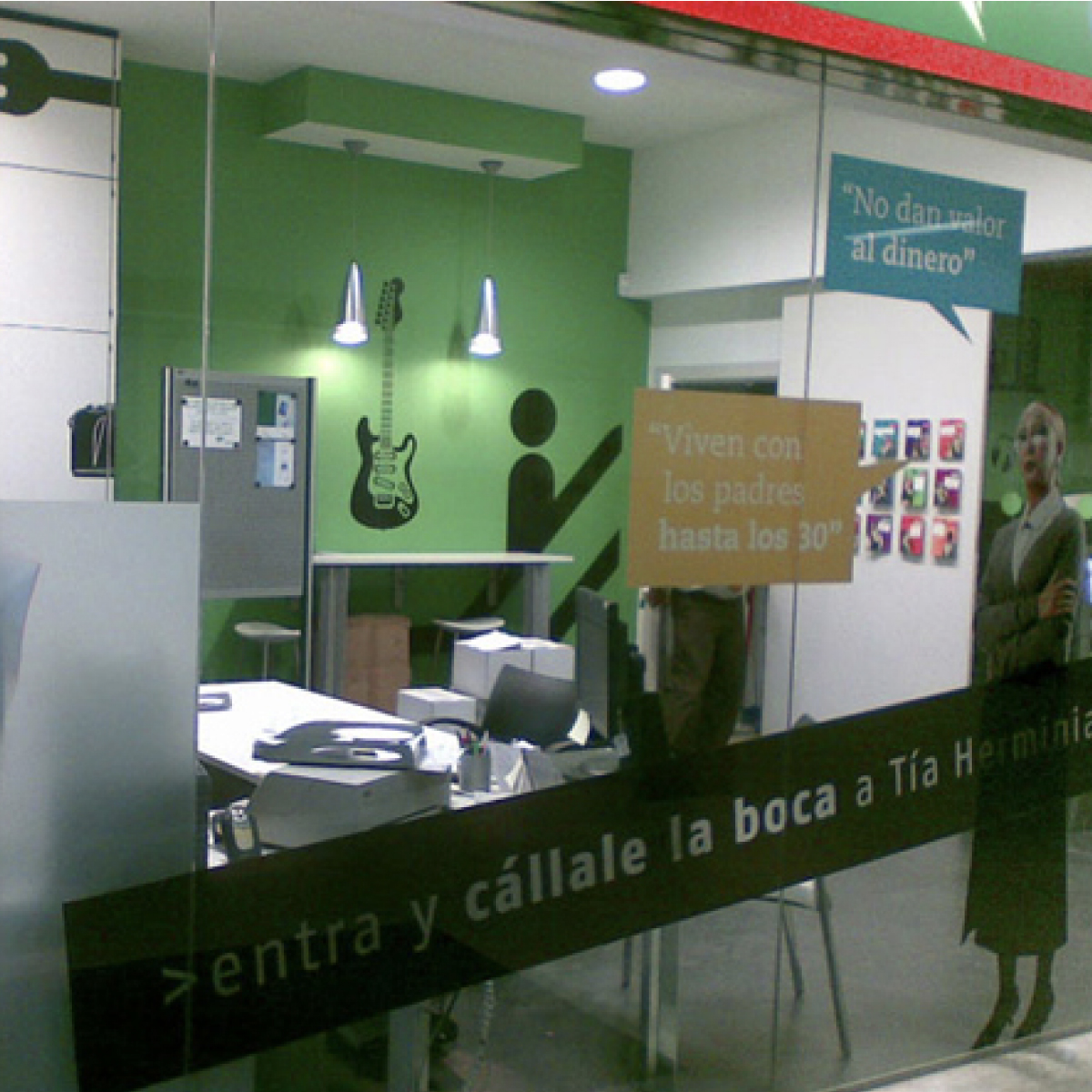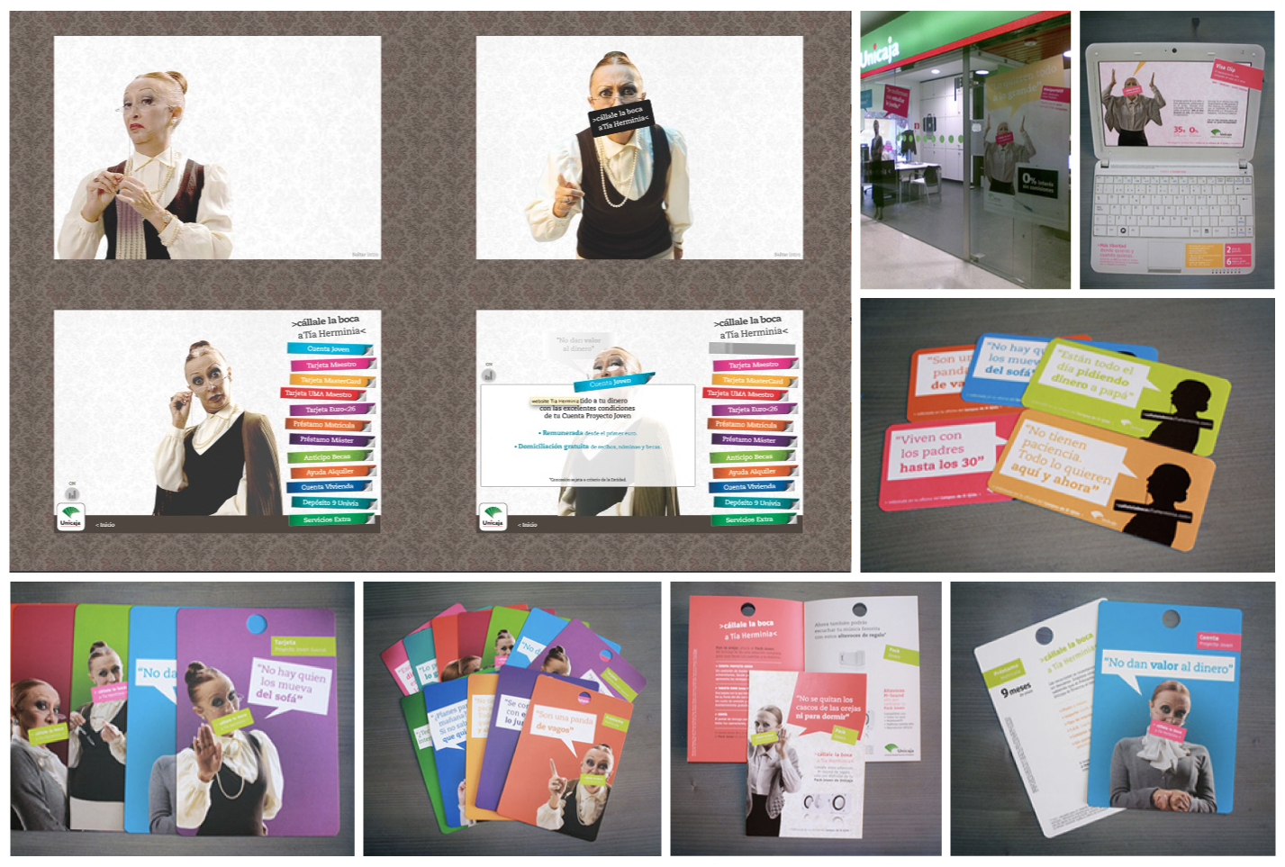 Trabajé durante 4 años en la agencia El Cuartel donde desarrollé parte de esta Campaña de Unicaja dirigida a público joven. La Tía Herminia es un personaje antipático que recrimina a los jóvenes que son unos vagos e irresponsables y se le calla la boca con un producto o servicio.